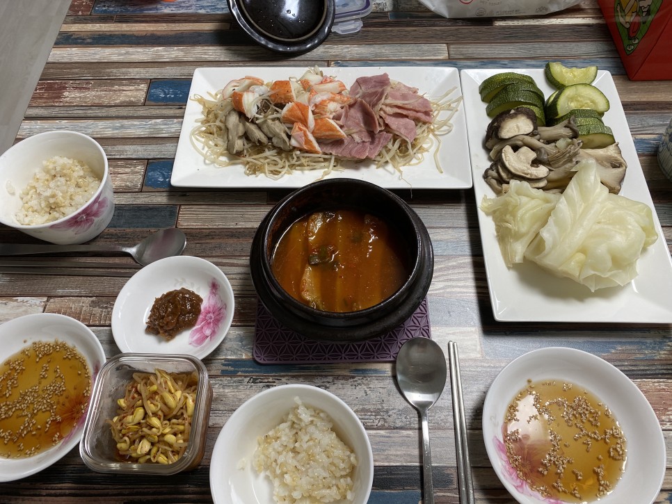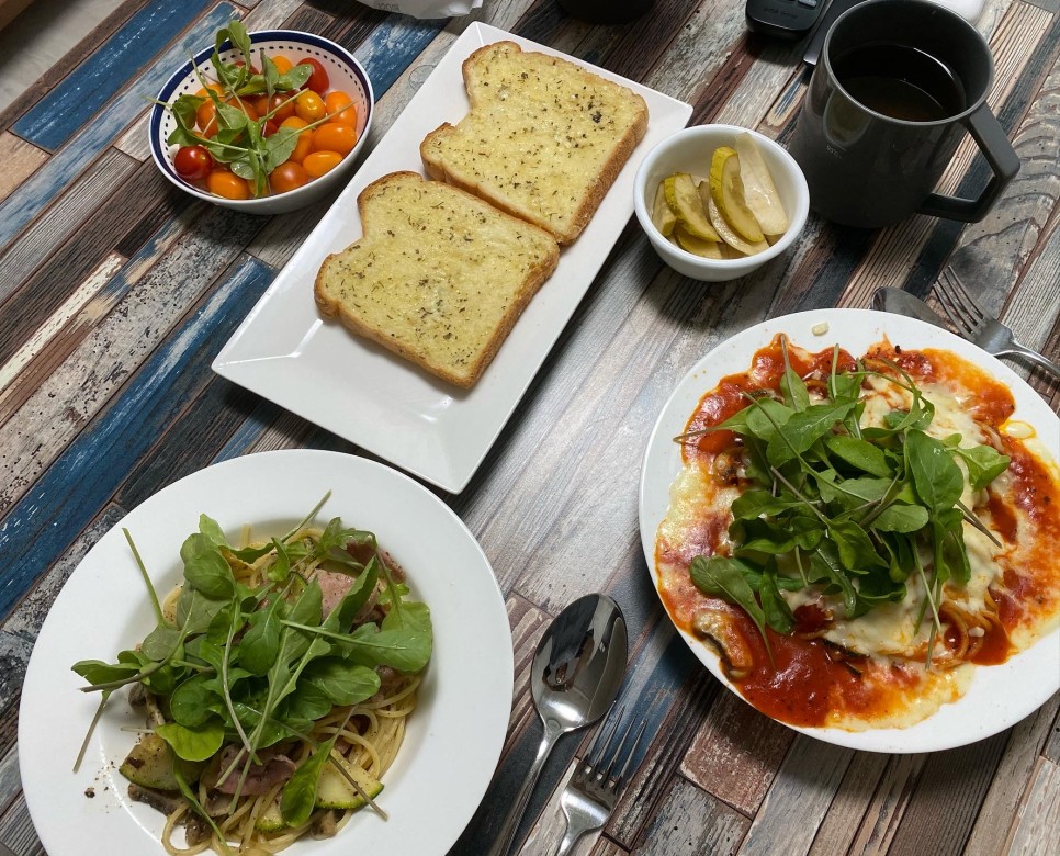 루꼴라 파스타&갈릭 토스트로 찌개, 야채, 밥은 항상 기본이고 야채에는 버섯, 숙주나물, 컬러 야채(깻잎, 파프리카, 호박 등)를 자유롭게 먹습니다. 루꼴라는 제가 좋아하는 야채라서 열심히 길러서 먹고 있어요.