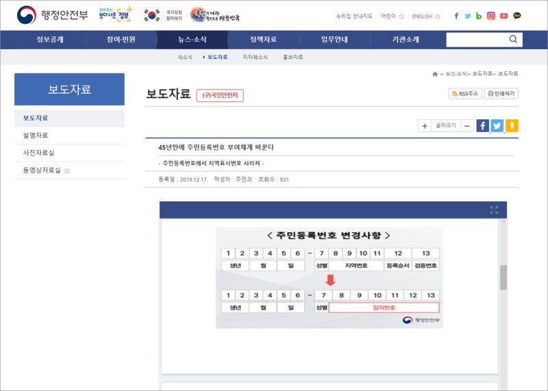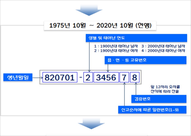 행정 안전부 보도 자료 참고 2019년 12월에 발표된 보도 자료에서 주민 등록 번호 뒷자리에 지역 번호를 없애는 임의 번호를 부여하는 방식으로 주민 등록 번호 부여 체계를 개편하겠다고 발표했습니다. 현재 주민 등록 번호는 75년부터 생년월일, 성별, 지역 번호 포함 13자리 수로 구성되어 왔는데 이번 계획은 지역 번호를 없애고 성별의 뒤 6자릿수를 임의 번호로 부여하자는 것입니다.그동안 주민 등록 번호 첫 번호를 부여하는 것에 대한 문제가 제기되고 모든 탈북자의 주민 등록 번호를 변경하기도 했죠.또, 생년월일과 출생 지역 등을 알면 주민 등록 번호가 쉽게 추정하는 문제가 행정 안전부 국정 감사에서 지적되기도 했어요.행정 안전부는 공공 기관이나 병원, 은행, 보험사 등 주민 등록 번호를 사용하는 기관이 치러야 할 추가 변경 비용이나 사회적 혼란을 막기 때문에 생년월일 및 성별은 유지하되 지역 번호를 폐지하는 방안에서 최종 결정했다고 설명했습니다.행정 안전부는 2020년 상반기 중 주민 등록 법 시행 규칙을 개정하고 현재 구축 중인 차세대 주민 등록 정보 시스템 번호 자동 부여 기능을 반영하고 10월부터 새로운 주민 등록 번호 체계를 적용할 예정입니다.기존에 부여된 주민 등록 번호는 그대로 사용하므로 주민 등록 번호 부여 체계 변경으로 국민 불편이 없는 것으로 보입니다.