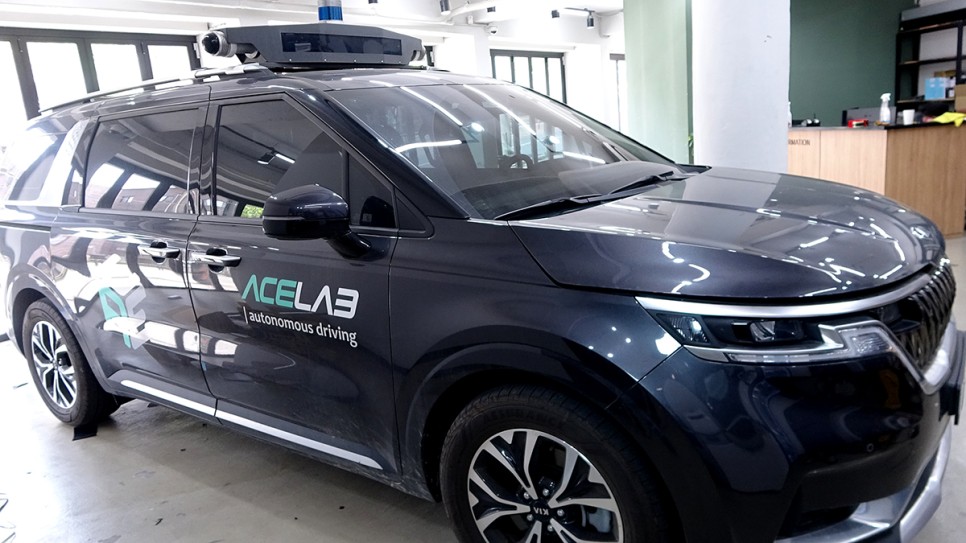 기아자동차 카니발의 자율주행차 시험운행 차량이라고 적혀 있습니다. 차내에 PC를 설치하여 자율주행 상태를 기록하려는 목적인 것 같습니다.