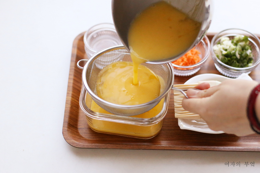 준비한 계란물을 체로 쳐서 체로 친다.이렇게 체를 치면 푸딩 계란찜처럼 탱글탱글하고 부드러운 계란찜을 만드는 방법이 된다.