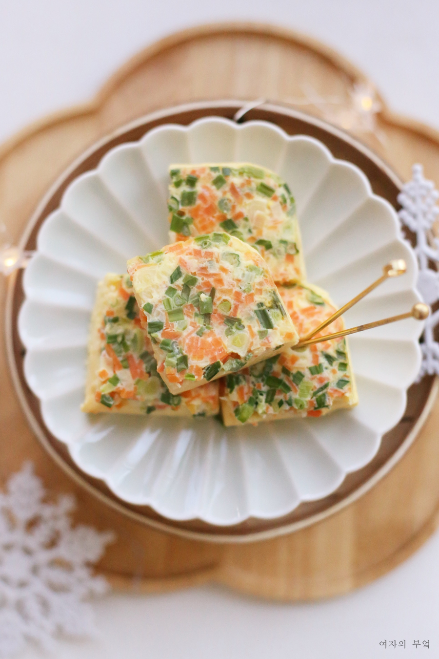 양념으로 쪽파 다진 것과 인삼 다진 것을 넣는다.이때 당근은 너무 많이 넣지 않으면 썰 때 모양이 무너지지 않고 먹을 때 딱딱하게 방해받지 않는다.