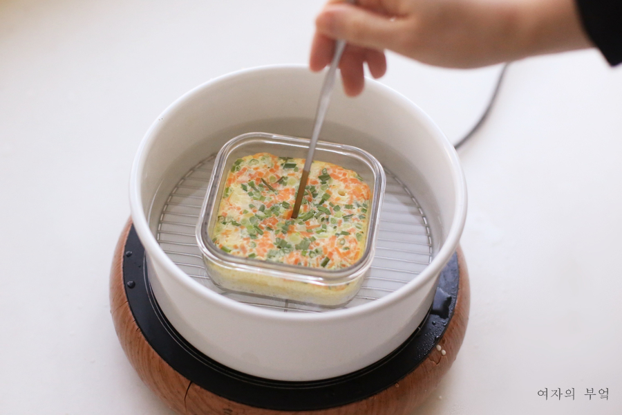 뚜껑을 덮고 약 10분 동안 끓인다.계란의 양과 물의 양, 불의 세기에 따라 삶는 시간은 달라진다.참고로 계란 6개로 급식 계란찜을 만들 때는 15분~20분 정도 걸린 것 같다.