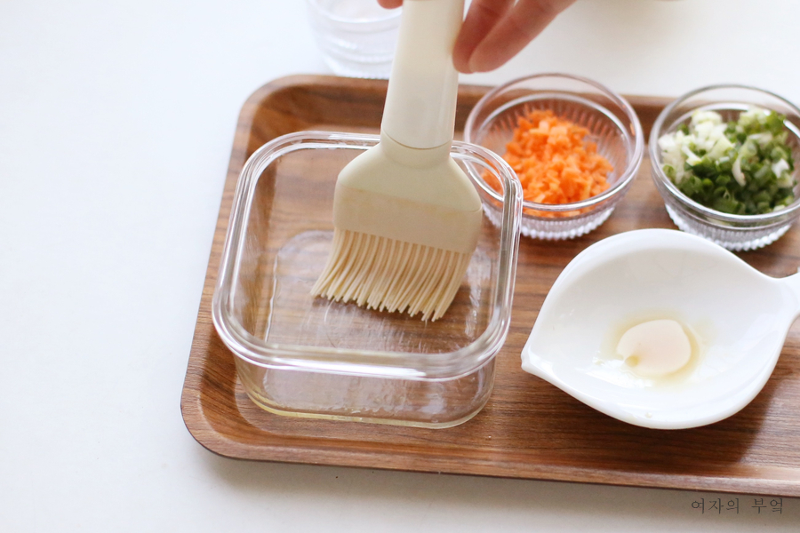급식계란찜 중탕기에 참기름을 바르면 나중에 빼기가 쉬워진다.또 참기름이 계란의 비린내를 없애는 데도 도움이 된다.바닥은 물론 벽면에도 꼼꼼히 발라줍니다.