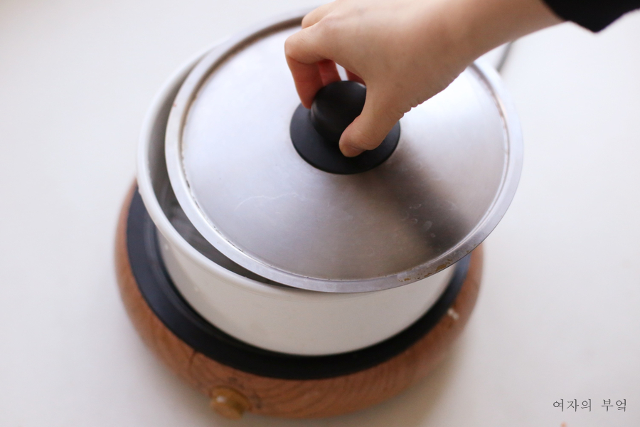 중탕기에 물을 팔팔 끓여서 그릇을 넣는다. 중탕기 안의 물은 찬통의 1/2정도로 하는 것이 좋다.너무 많으면 끓어서 물이 위로 올라와 그릇에 담을 수 있고 너무 적으면 빨리 익지 않을 수 있다.