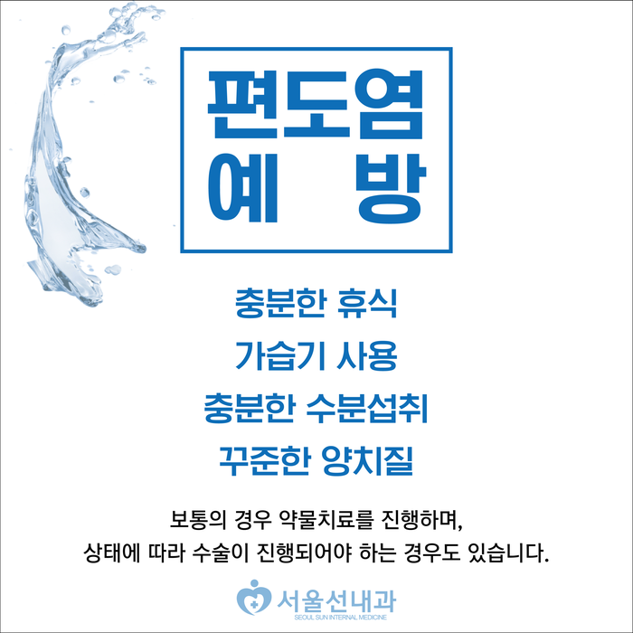 편도염을 예방하기 위해서는 충분한 휴식, 수분 섭취, 입안의 청결을 유지할 것을 권합니다.일반적으로 가벼운 약물 치료로 끝내는 경우도 있지만, 상태에 따라 수술이 이루어질 수도 있습니다.