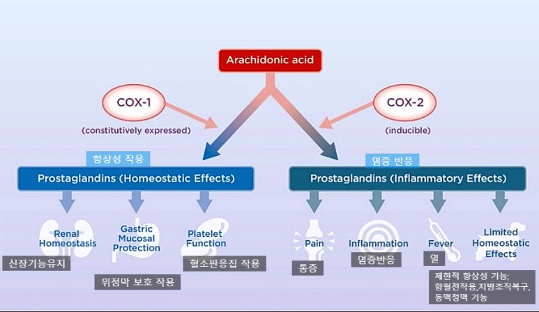 #NSAIDs(비스테로이성소염진통제)의 작용기 전에 많이 사용하는 NSAIDs는 #COX-1과 #COX-2의 작용을 억제하여 프로스타글란딘을 만드는 것을 방해하고 염증이 생기지 않도록 하며 통증을 완화시킵니다.