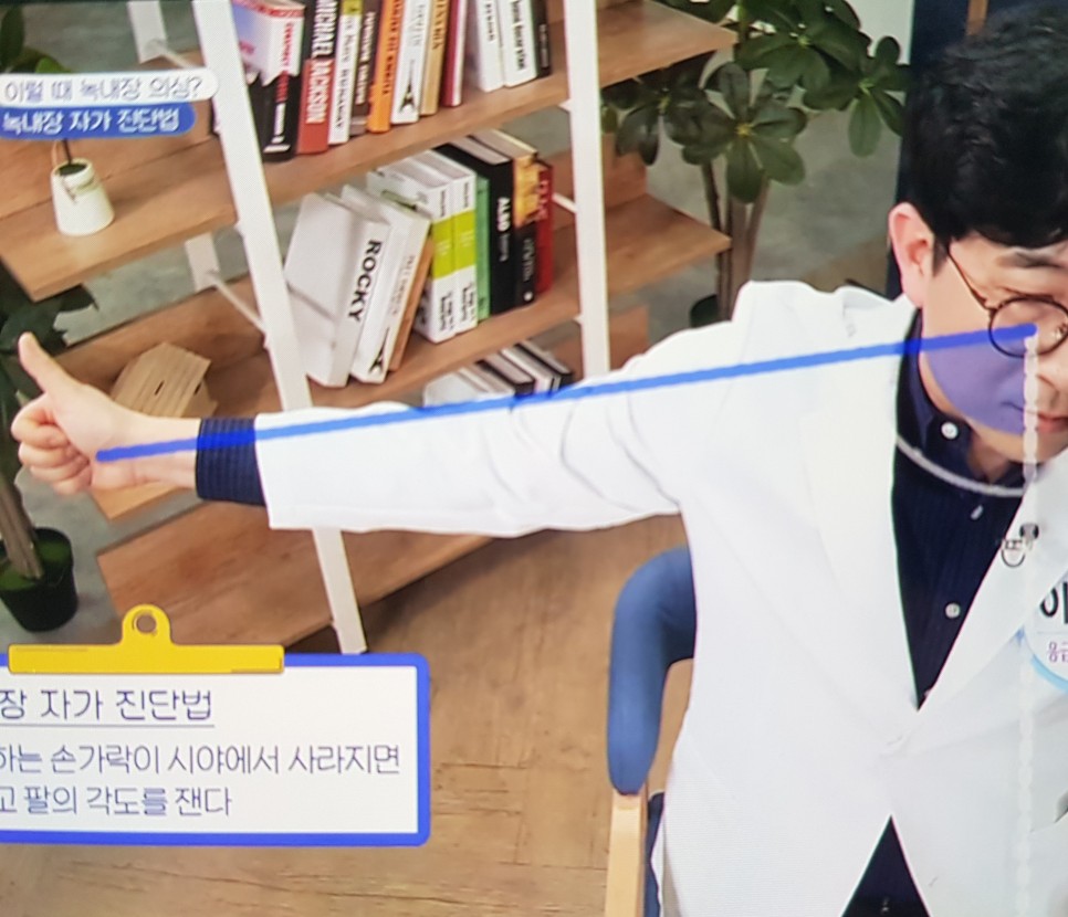 본인의 팔이 90도 이상을 넘으면 정상으로 보이고, 팔의 이동범위가 80도 이하면 녹내장을 의심할 수 있다고 합니다.