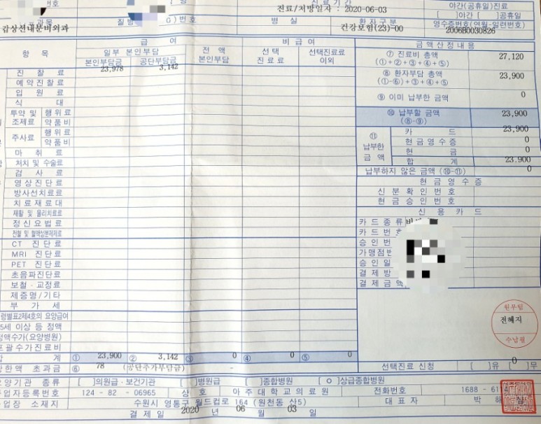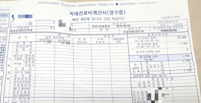 최초 외래 진료 비용 / 아주대학교 병원 외래 병원비 / 갑상선 추적 검사 갑상선암 수술 후 6년, 기록 8. 산정 특례 종료 후