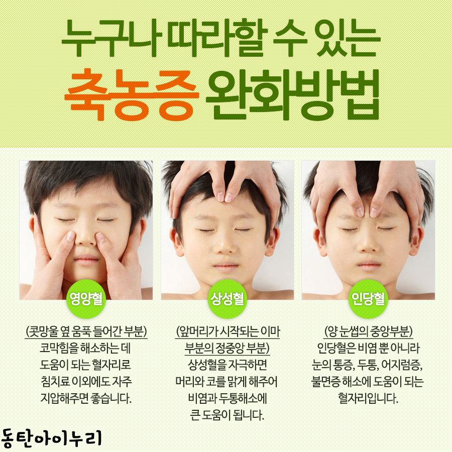 ★누구나 흉내낼 수 있는 부비강염 돈탄축농증 경혈마사지 ★아이가 자주 코를 막고 숨을 쉬기 어렵다면 코막힘 해소에 도움이 됩니다.5~10분간 경혈을 눌러 축농증 마사지를 합니다.