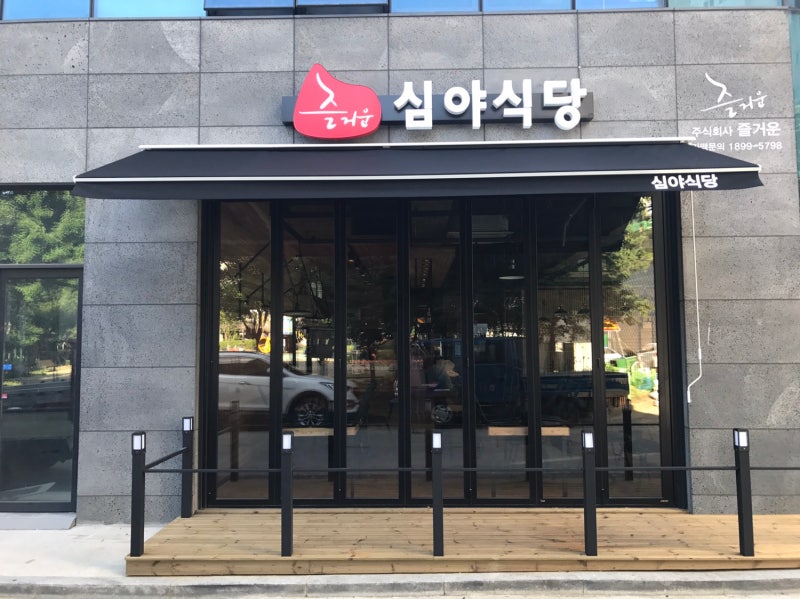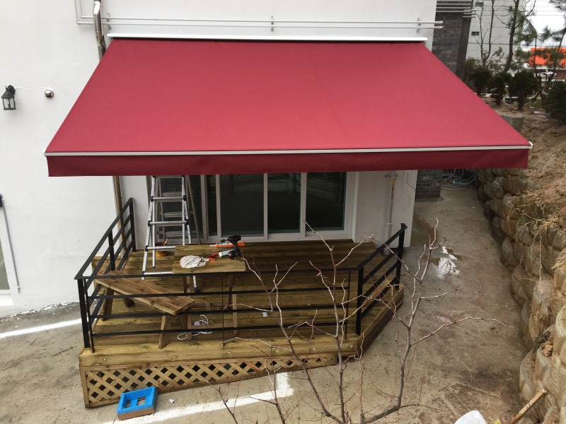 이렇게 벽 브라켓의 시공이 끝나면 어닝을 벽 브라켓에 넣어 어닝을 펼칩니다.
