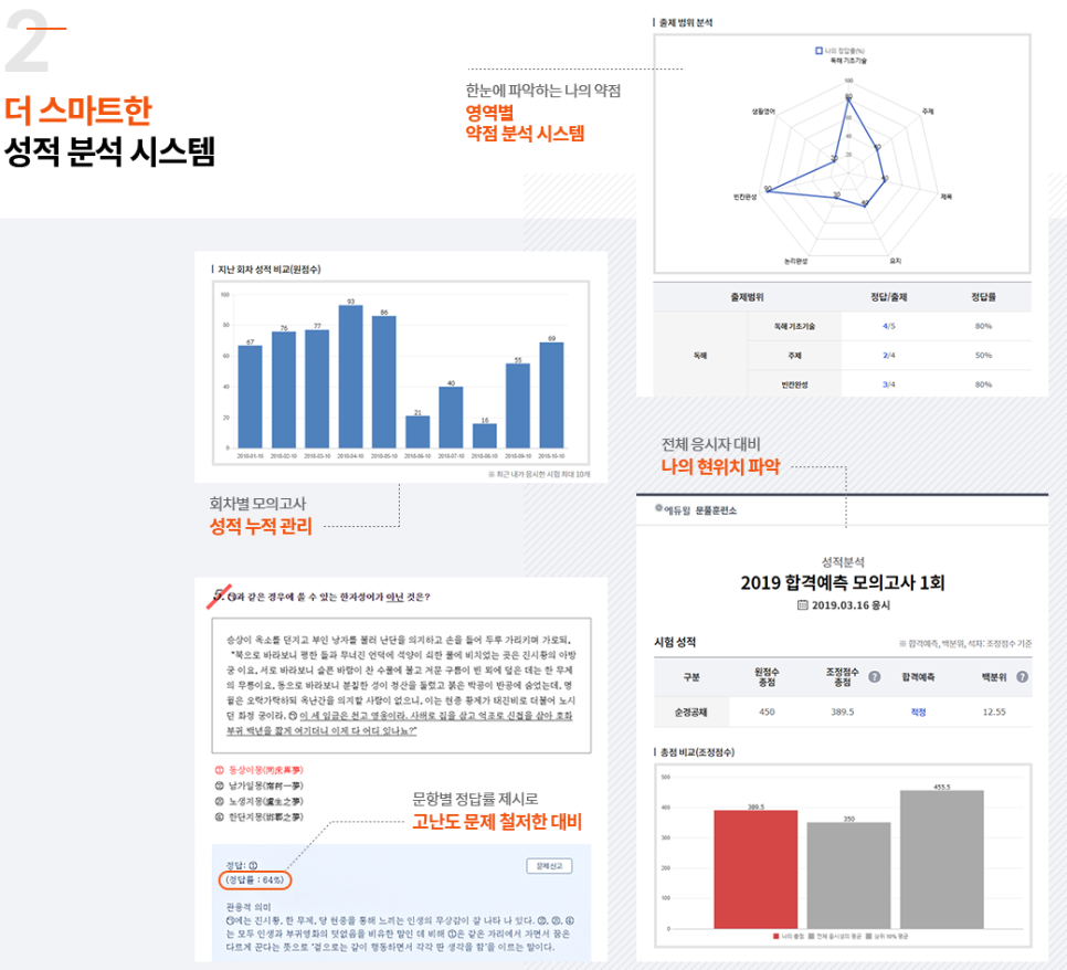 뿐만 아니라 성적도 꼼꼼하게 분석을 하고 나왔는데 전체의 수험자에 비해 자신의 위치가 어느 정도인지 파악할 수 있어 갑자기 위기 의식이 솟았습니다.(웃음) 그리고 자기 점수로 합격할 수 있을지도 몰라요! 저는 다행히 합격권 안에 들었지만 평소 기출문제나 모의고사를 풀 때보다 점수가 낮고 나머지 시간은 더 열심히 공부해야겠다고 생각했습니다. 틀린문제는오답노트기능으로다시복습해서정리할수있었고,틀린문제까지제대로오답정리했습니다! 1월 30일까지 접수 및 응시가 가능하니 올 상반기 채용을 목표로 하시는 분들은 모의고사 한번 신청해 보세요!
