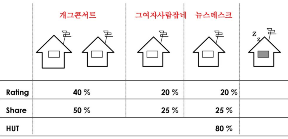 EX. 2019년 4월 8일 밤 10시 30분에 총 1000가구 중 500가구가 TV를 갖고 있으며 500가구 중 250가구가 특정 프로그램을 볼 경우 해당 프로그램 점유율은 50%(250/500)다.