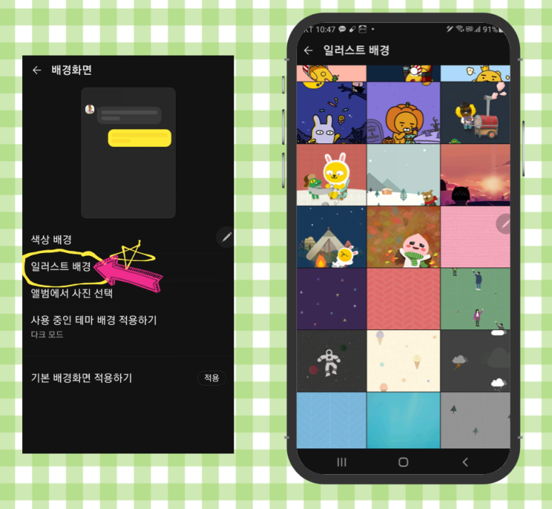 ●일러스트 배경 다양하고 귀여운 카카오톡 캐릭터나 일러스트가 나오니 여기서 선택해 주세요.