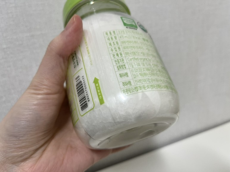 병이 통통하고 귀엽네요.저는 오일이라고 해서 액체인가 했더니 추워서 얼어버렸어요.순수 코코넛 오일은 24도 이하에서는 응고가 될 수 있다고 적혀있어요그래도 품질이나 제품 성질에는 변화가 없어요.