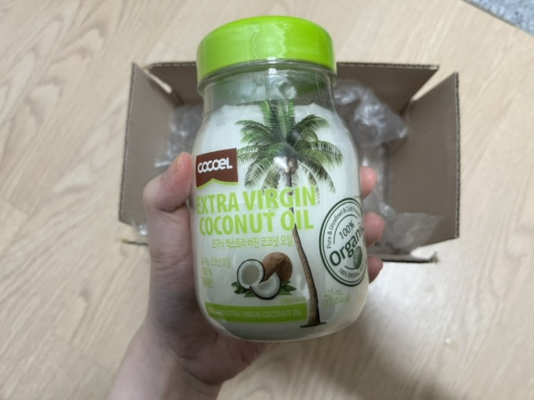 거기서 소개해드리는 코코엘오가닉 엑스트라 버진 코코넛 오일입니다!택배는 에어캡으로 싸여 왔습니다.