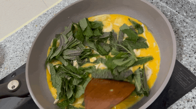 여기다가 깻잎이랑 계란까지 넣고 볶습니다