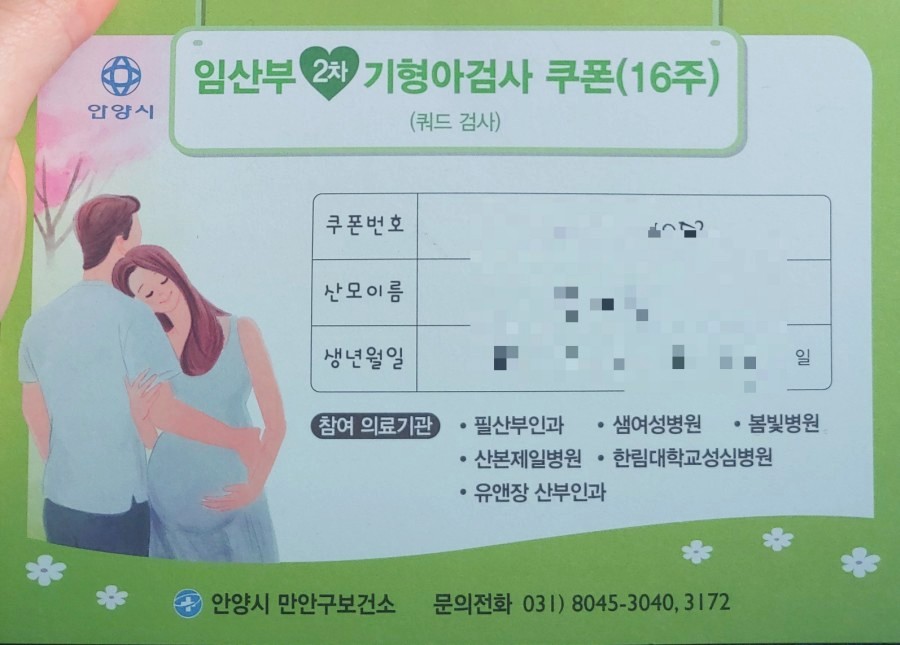보건소에 가면 1,2차 기형아 검사 쿠폰을 나눠줘요.1차 기형아 검사 쿠폰은 초음파 검사비만 지원해 주기 때문에 약 2만원 정도를 절약할 수 있으며, 2차 기형아 검사는 쿼드 검사를 무료로 할 수 있습니다.