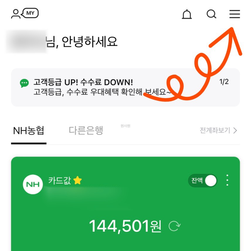 일단 농협 스마트 뱅킹 앱을 이용하려면 맨 오른쪽 상단에 선이 3개 그어져 있는 것을 클릭하면 됩니다.열 세 개는 메뉴 국물 룰