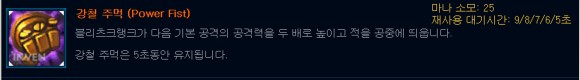 강철권 E 스킬은 불츠에게 두 번째로 중요한 스킬입니다.Q 로켓의 손으로 소환에서 하늘로 날려 보내든 E 강철 주먹으로 날려 다시 당겨도 아주 좋은 호흡을 자랑하는 메인 스킬입니다.지속시간이 5초이기 때문에 너무 많이 사용하면 멍해질 수 있으니 항상 주의해 주세요.