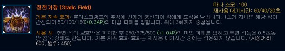 궁극기 R 정전기장은 기본 지속 효과도 매우 좋지만 일타 또는 라인전 때 매우 중요한 역할을 하는 스킬입니다.탱커에 갈 경우 피해가 약하지만 사용할 경우 적의 실드를 파괴한 후 피해와 0.5초라는 짧은 시간 침묵 상태에서 아무것도 할 수 없게 할 수 있습니다.정말 최고의 스킬이라고 할 수 있습니다모르가나E 블랙쉴드 스킬의 경우는 상당히 피곤하지만 그것을 한 번에 깨뜨려 상대를 무력화시킬 수 있기 때문에 모르가 서포트의 경우는 이 점을 활용하여 성공적인 일타를 만들어 보시기 바랍니다.