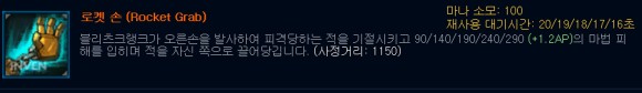 제일 중요한 스킬이겠죠? 불츠는 Q스킬로 시작해서 끝난다고 해도 과언이 아닙니다.바로 로켓슨 스킬입니다하지만이스킬이실패하면스킬쿨이길기때문에상대방이들어와원본을계속얻을수가있으니신중하게사용해주세요.저 같은 경우에는 완벽한 상황이 아닐 경우 진입 후 E-스킬(강철주먹)을 사용하여 하늘로 한번 올려주고, 상대가 도주할 경우 록켄 손으로 다시 한 번 앞으로 소환합니다.ㅎ 그럼 쉽게 킬각이 나오고 원딜도 쉽게 넣을 수 있습니다.위에서 말씀드린 바와 같이, 한 타시에 영웅이 될 수도 있고 데스 그랩에 역적이 될 수도 있는 기술입니다.