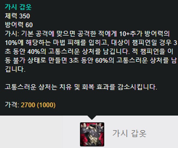 앞으로 다음 아이템으로는 가시 갑옷을 추천합니다.서포트불츠는탄의역할을한다고했죠?어차피딜이안나오기때문에치유및회복효과를감소시키는고통스러운효과를지속적으로상대딜러에게주고한방에승리할수있도록팀에도와야합니다.낮은 티어로 충분히 킬다리가 나오지만 지감(치유감소의 줄임말) 아이템을 아무도 가지고 있지 않아 한 타에 지고 마는 경우가 있으니, 저희 팀 딜러가 가지 않을 경우를 대비하여 가시 갑옷을 착용해 둡시다.