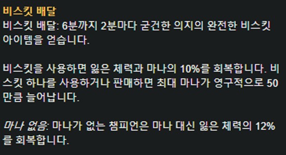 부릉에서 저는 이게 라인 유지력에 큰 도움이 된다고 생각해요글러브스킬로 시작해서 끝난다고 해도 과언이 아닌 서포트 불츠의 경우 스킬 쿨도 너무 길어서 짜증이 나지만.. 너무 많은 말과 소비로 인해 효율이 떨어질 수 있습니다.비스킷 배달은 총 3 개의 비스킷을 6 분에 2 분마다 3 개 주게 됩니다.이것을사용하면잃어버린체력과마나를10%회복시켜주기때문에라인전유지력에굉장히중요한부분이라고할수있습니다.