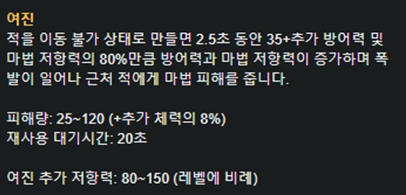 여진이 올 때는 정말 중요한 룬 중 하나라고 생각해요.부르츠라고 이니시를 하거나 탱커의 역할을 하거나 아군을 보호하기 위한 룬이라고 생각합니다.마법저항력과방어력을더높이는것이매우중요합니다.