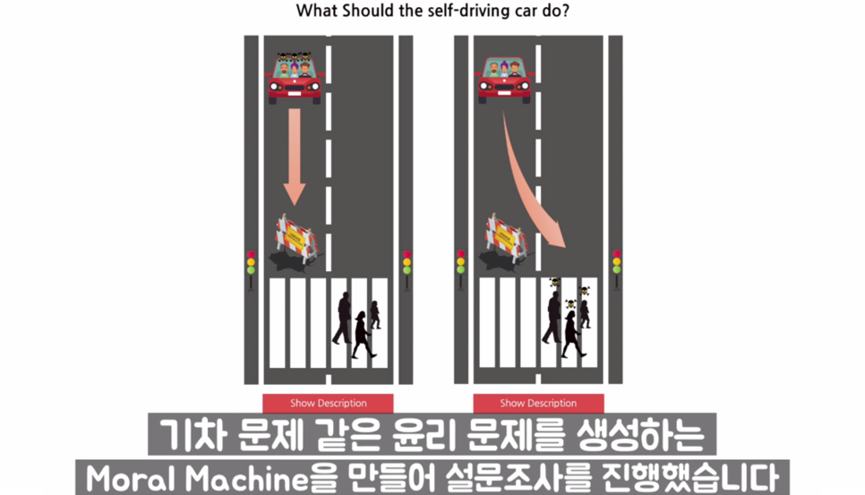 이와 관련해 MIT 데이터시스템 사회연구소 아이야드 라판 교수 연구팀은 기차 문제와 같은 윤리 문제를 생성하는 도덕적 기계(Moral Machine)를 만들어 설문 조사를 실시했습니다.