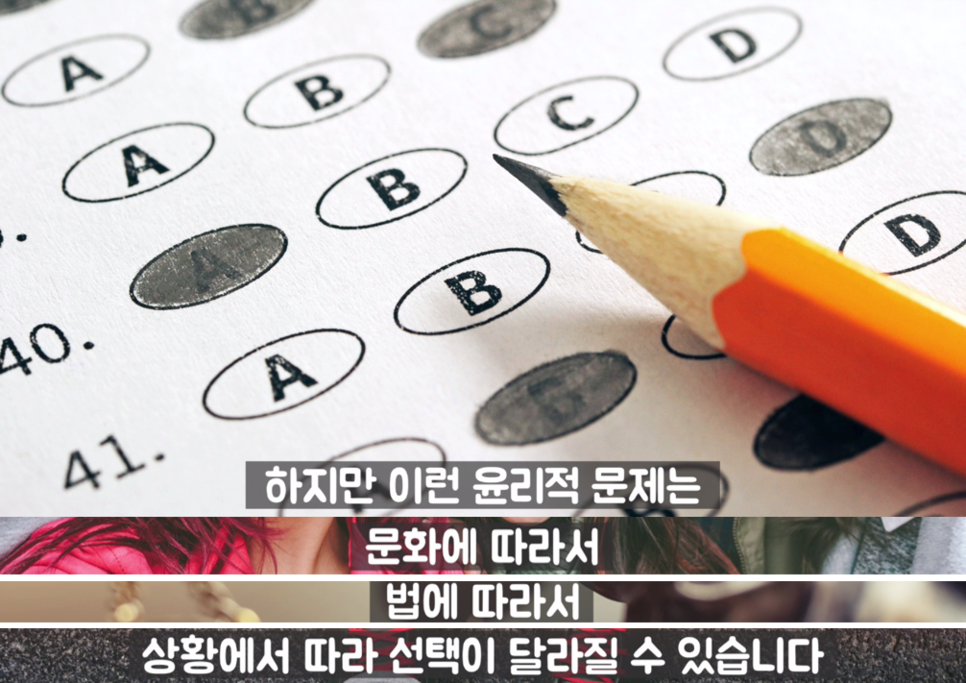 하지만이윤리적문제는하나의정답이정해져있는게아니고,문화에따라서,법에따라서,상황에따라서선택이달라질수가있어요.
