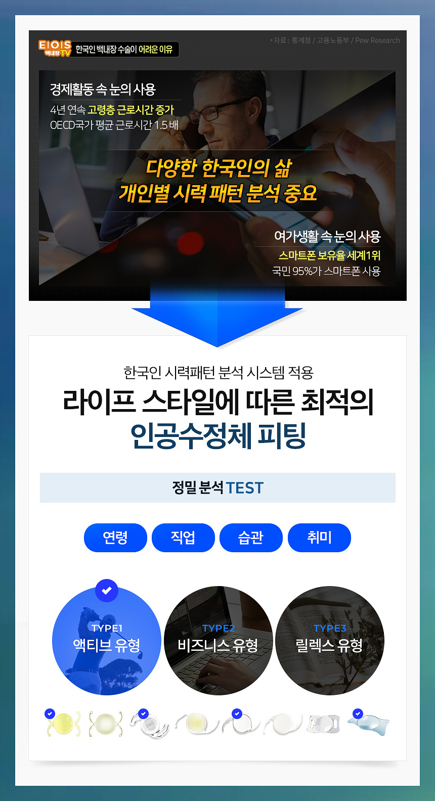 체계적인 과정과 함께 현재의 직업, 일상 속 습관, 취미 등의 요소를 모두 수집하고 분석하여 시력 패턴을 진단하고 그에 어울리는 인공수정체를 찾고 있었습니다.