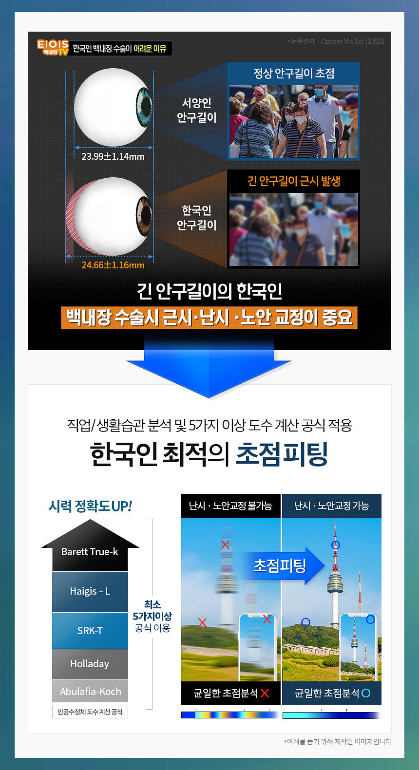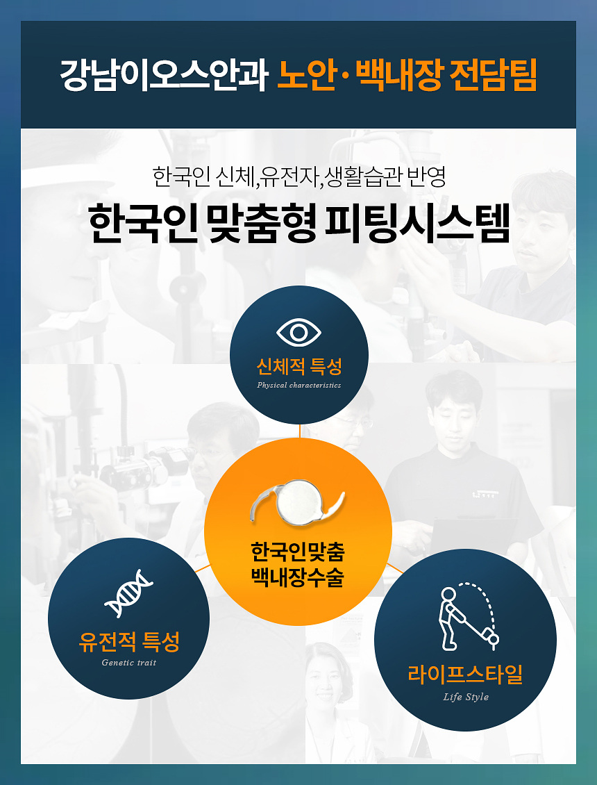 이러한 문제점을 벗어나 개인에게 적합한 방안을 제시하고자 이오스 노안백내장 전담팀은 <한국인 맞춤형 피팅 시스템>을 고안하여 발표하게 되었습니다.