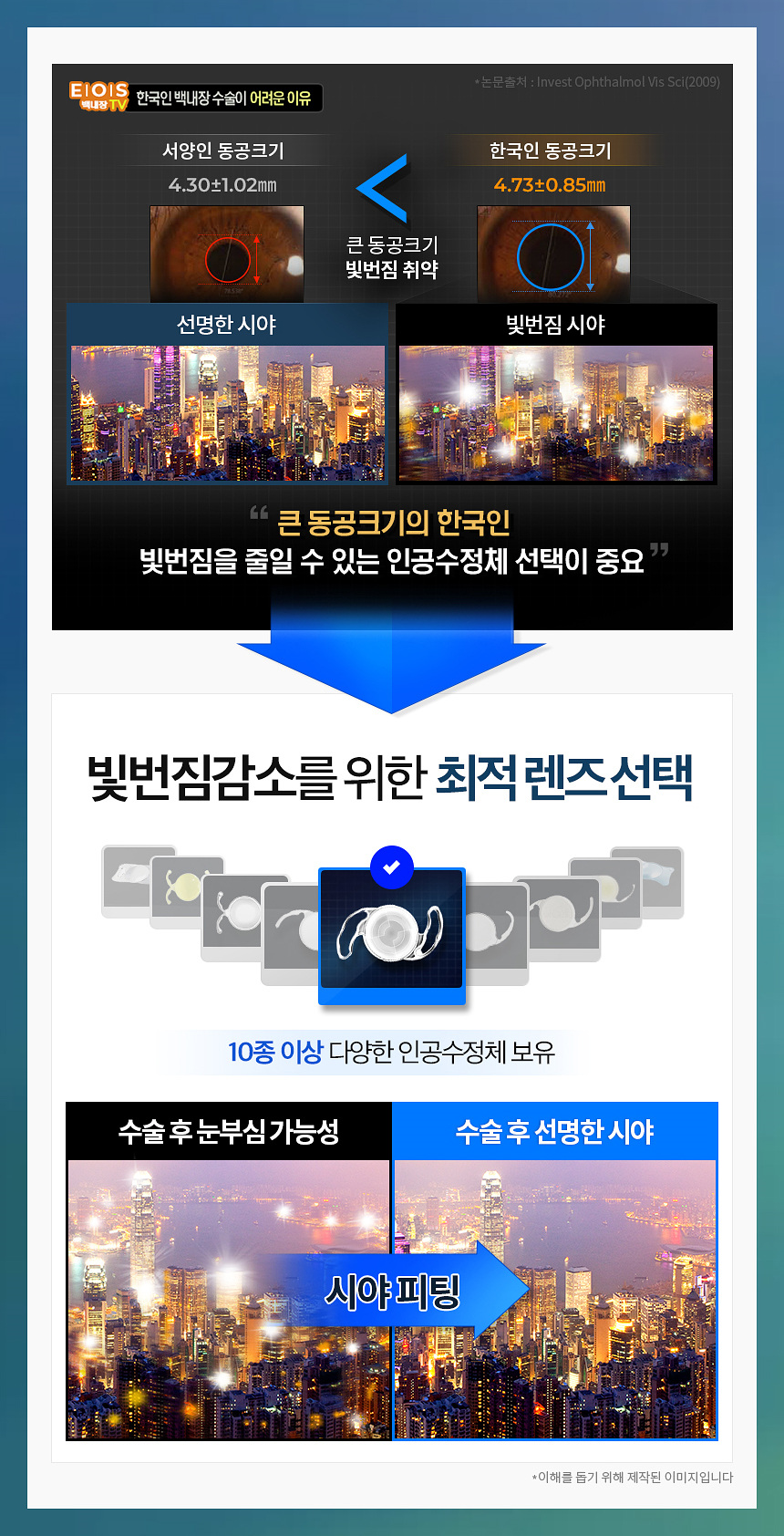 한국인과 서양인의 경우 유전적인 부분부터 신체적인 조건까지 모두 다른데도 동일한 인공수정체를 사용하고 있어 백내장 수술 부작용 등 안타까운 결과를 낳을 확률이 높았는데요.