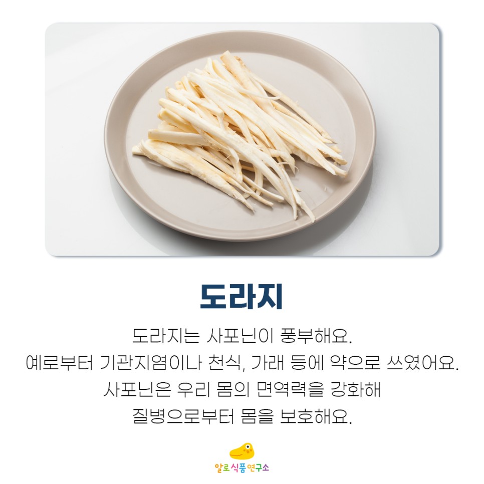 도라지는 사포닌이 풍부하여 예로부터 기관지염, 감기, 천식, 가래 등에 약으로 사용되고 있었습니다.사포닌은 우리 몸의 면역력을 강화하고 질병으로부터 싸울 수 있는 힘을 키웁니다.