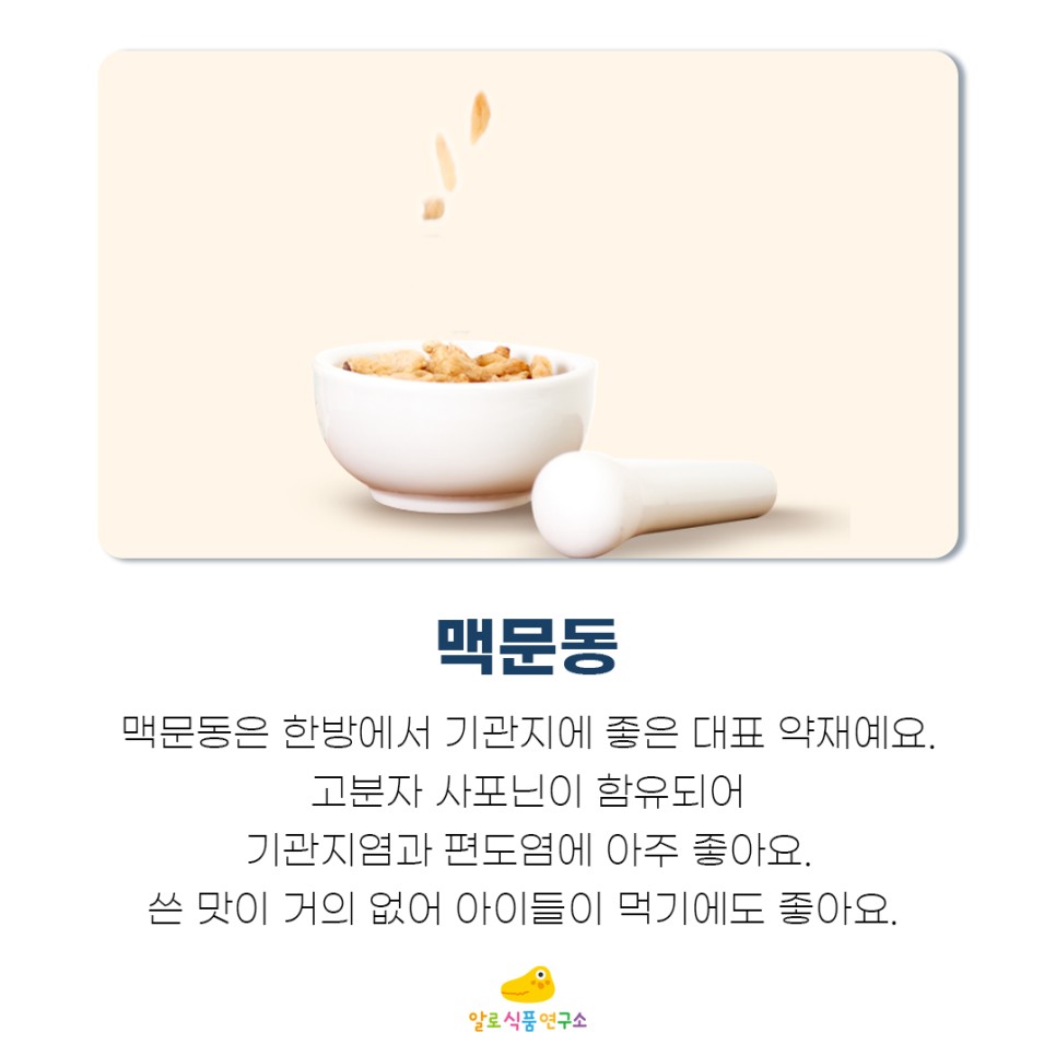 맥문동은 조금 생소한 음식입니다.하지만 기관지나 호흡기에 좋은 대표적인 약제입니다.고분자 사포닌이 포함되어 있기 때문에 유아 기관지염이나 편도염에 매우 적합합니다.쓴맛이 거의 없어 아이들이 보리차처럼 편하게 마시기 좋아요.