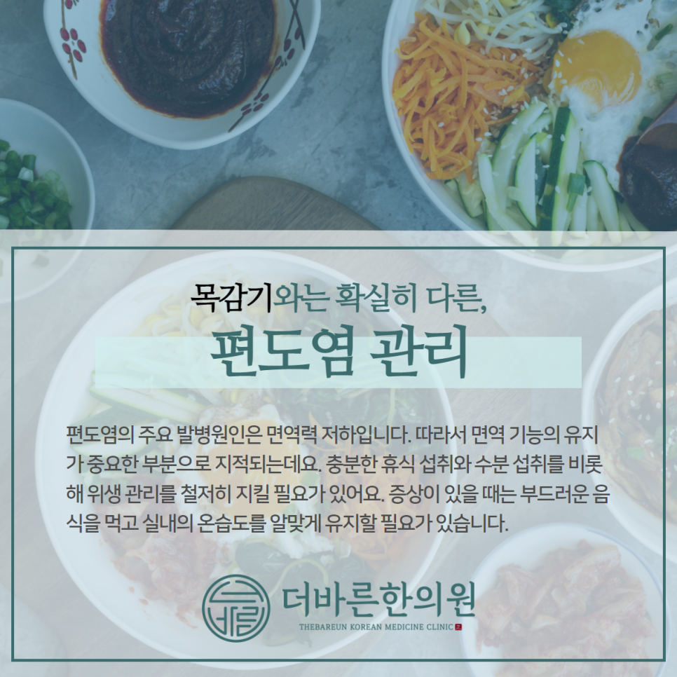 편도염 관리의 주요 원인 중 하나가 면역력 저하이므로 편도염에서는 잘 먹고 잘 자는 것이 매우 중요합니다.적절한 수준의 운동과 위생관리가 중요합니다.특히 빈번하고 꼼꼼한 손 씻기를 통해 세균이나 바이러스의 유입을 차단하는 것이 좋아요.구강 청결에도 신경을 써야 합니다.편도염을 의심할 만한 증상을 보이는 경우에는 음식도 가급적 부드러운 것으로 먹되 실내 온습도 적정 수준을 유지하도록 합니다.과음이나 과로, 스트레스와 흡연은 편도염을 악화시키는 원인이 될 수 있으므로 삼가는 것이 좋아요.