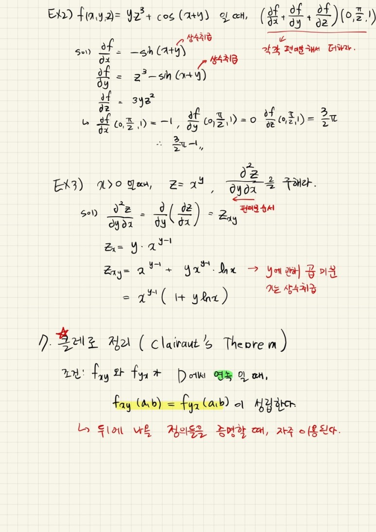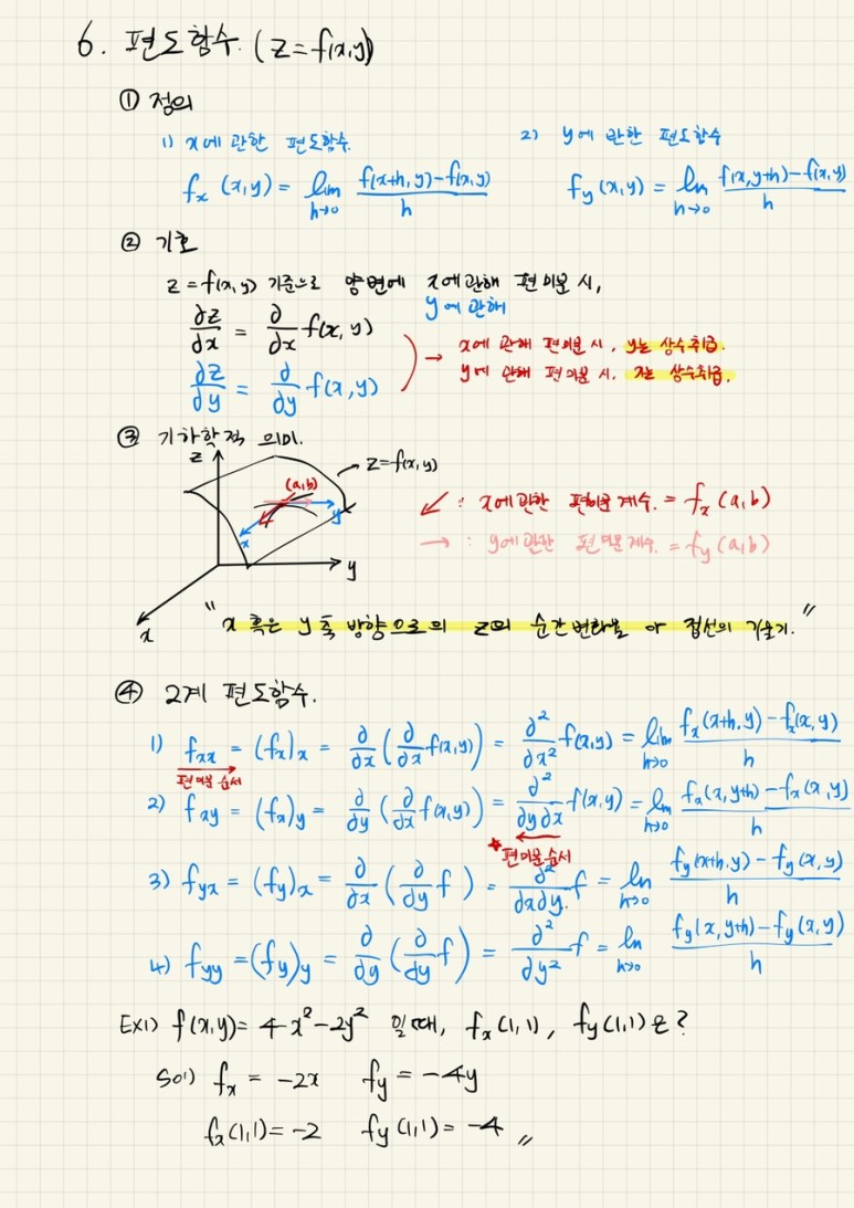 편미분 중요 포인트는 나머지 변수를 정수 취급하는 것이다. 또 미분의 기호에 따라 편미분의 순서도 파악할 수 있다.