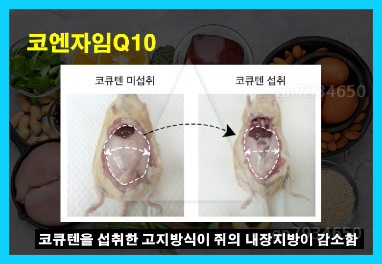 코엔자임 Q10의 연구결과로 코큐텐을 지속적으로 섭취한 쥐와 섭취하지 않은 쥐의 실험결과가 있습니다.마찬가지로 고지방식을 섭취했는데, 코큐텐을 섭취한 쥐의 내장지방이 현저히 줄어든 실험결과로 온몸에서 필요한 것과 콜레스테롤 수치를 낮추는 데에도 뛰어난 성분이라고 할 수 있습니다.