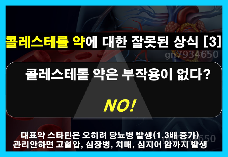 콜레스테롤 약에 많이 사용되는 성분 스타틴은 심각한 부작용을 일으킬 수 있습니다. 대표적인 예로는 당뇨병을 유발할 수 있습니다.스타틴이 콜레스테롤 수치는 낮출 수 있지만 혈당을 높이기 때문입니다. 당뇨병도 평생 약을 먹으면서 관리해야 하는 질환이기 때문에 스타틴에 의해 당뇨병이 발병하면 평생 콜레스테롤과 함께 당뇨를 관리하기 위해 약을 복용해야 하는 처지가 될 수 있습니다.