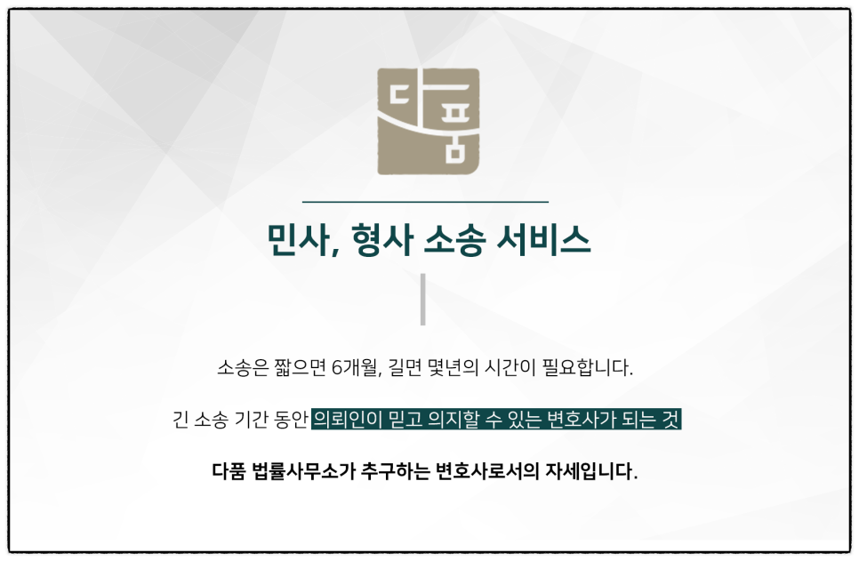 다품법률사무소에서는 전화상담부터 사건진행, 소송까지 총 10년 경력의 대표변호사가 직접 사건을 맡아 긍정적인 결과를 낼 수 있도록 최선을 다하고 있습니다. 또한 대형 로펌급의 수준 높은 법률서비스를 합리적인 금액을 통해 제공하고 있습니다.