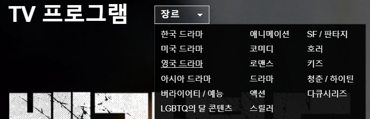 넷플릭스의 TV 프로그램은 한국 드라마, 미국 드라마, 영국 드라마, 아시아 드라마, 버라이어티/예능, LGBTQ의 달 콘텐츠, 애니메이션, 코미디, 로맨스, 드라마, 액션, 스릴러, SF/판타지, 공포, 키즈, 청춘/하이틴, 다큐멘터리 시리즈로 분류되어 있습니다.