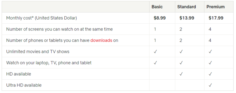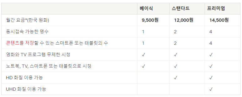 한국 기준으로 베이직이 9500원, 스탠다드 12,000원, 프리미엄이 14,500원, 2인 이상 볼 경우 스탠다드/프리미엄이 화질이 HD, UHD여서 훨씬 좋습니다.컨텐츠 저장 폰이나 탭 수(Number of phonesortablets youcan havedonwnloadson)가 빨간색으로 표기되어 있습니다. 와이파이가 없을 때는 이 숫자가 중요하기 때문일까요?