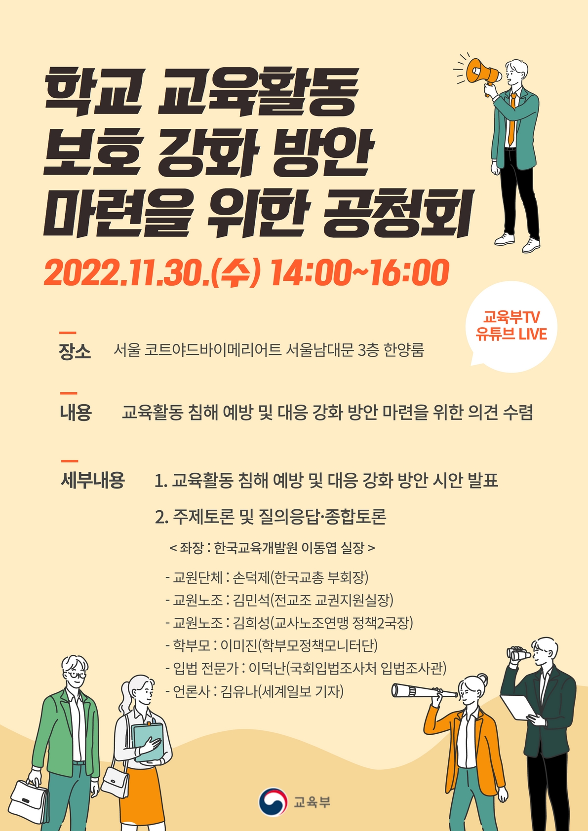 학교교육활동 보호 강화 방안 마련을 위한 공청회 일시 : 2022년 11월 30일(수) 14:00~16:00 장소 : 서울 코트야드 바이메리어트 서울 남대문 3층 한양룸(교육부 유튜브 LIVE : https://www.youtube.com/@ourmoetv) 내용 : 교육활동침해예방 및 대응강화 방안 마련을 위한 의견수렴 #교육부 #교육활동 #침해예방 #대응강화 #주제토론 #공청회