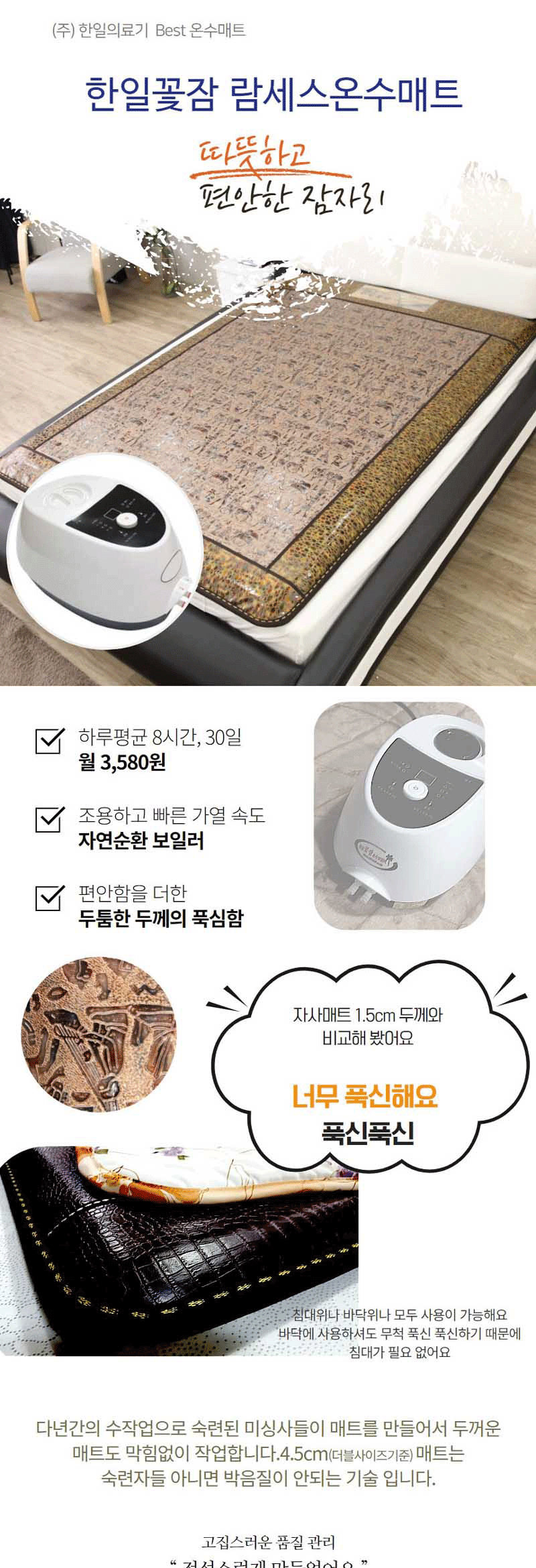 온수매트는 사람의 몸이 직접 닿는 관계로 뒤척임에도 문제가 없도록 깨끗하고 꼼꼼하게 세부적인 마무리 처리까지 신경썼습니다. 이제 안심하고 잘 수 있어요. 푹신한 사용감