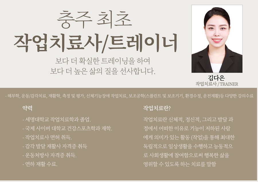 전문학교를 졸업하고 면허, 전문자격증을 가진 트레이너 선생님이 담당합니다.이번달 새로운 마음가짐으로 헬스 또는 운동 또는 재활을 원하신다면 국제 및 국내자격증 보유 선생님들께 착한 가격에 행사가격을 금액으로 이용해보세요!!!…최고의 퀄리티를 저렴하게 즐기실수 있습니다!…