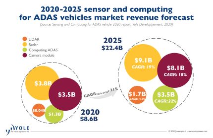 엄청난 시장 규모를 자랑하는 ADAS 인지 센서는 카메라, 라이더, 레이더 기술이 있습니다.