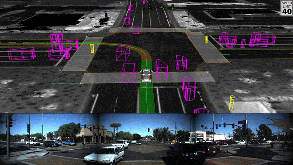 또한 라이더는 360º로 회전하는 센서로부터 받아들인 정보로 진행방향에 따라 향후 도로상태, 신호를 예측하여 운행에 반영합니다.