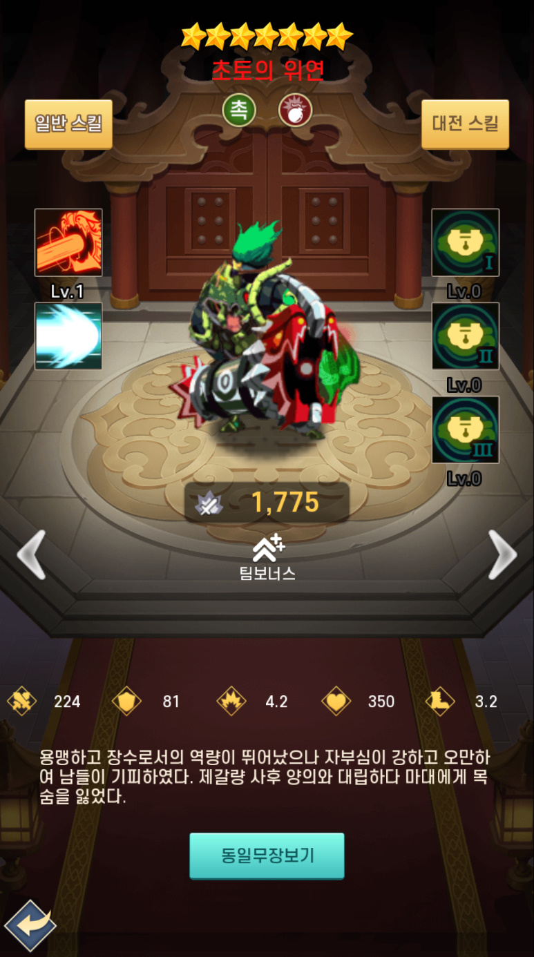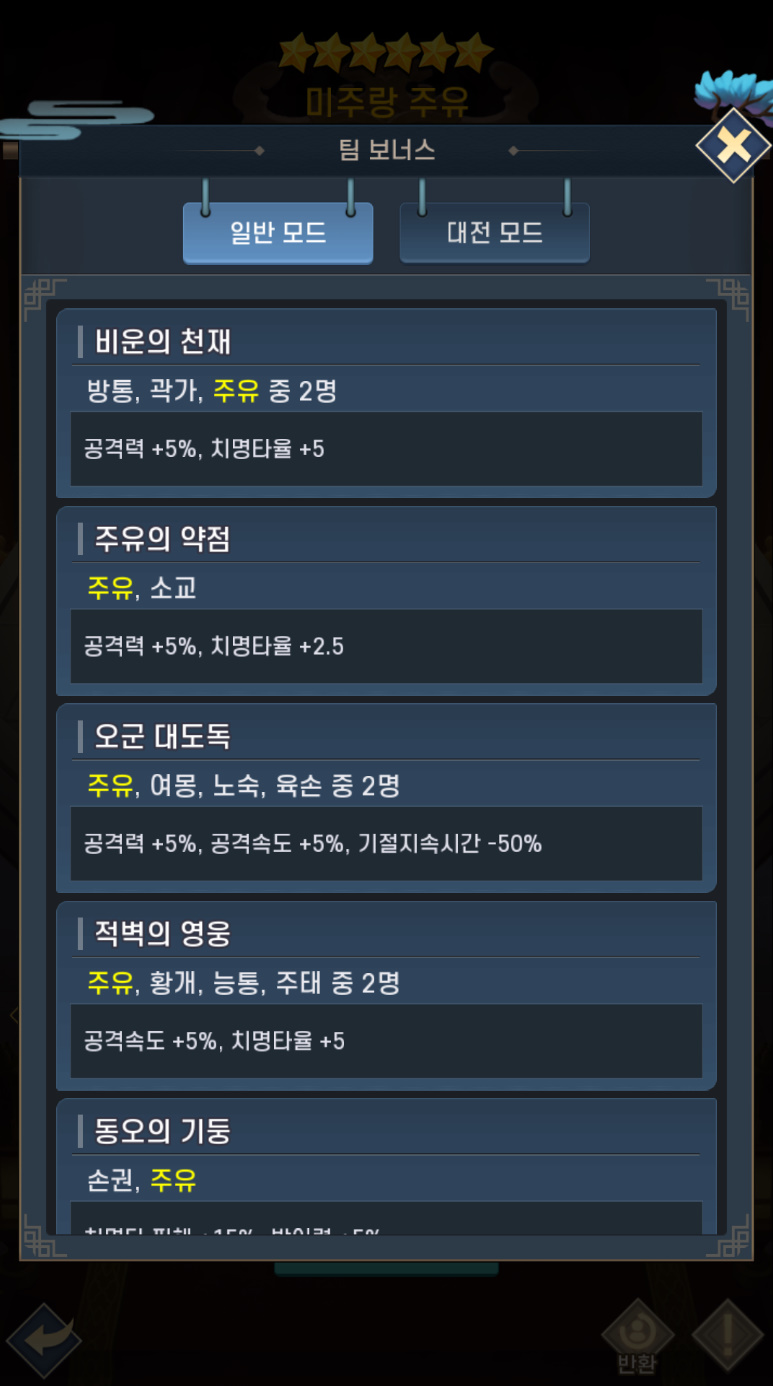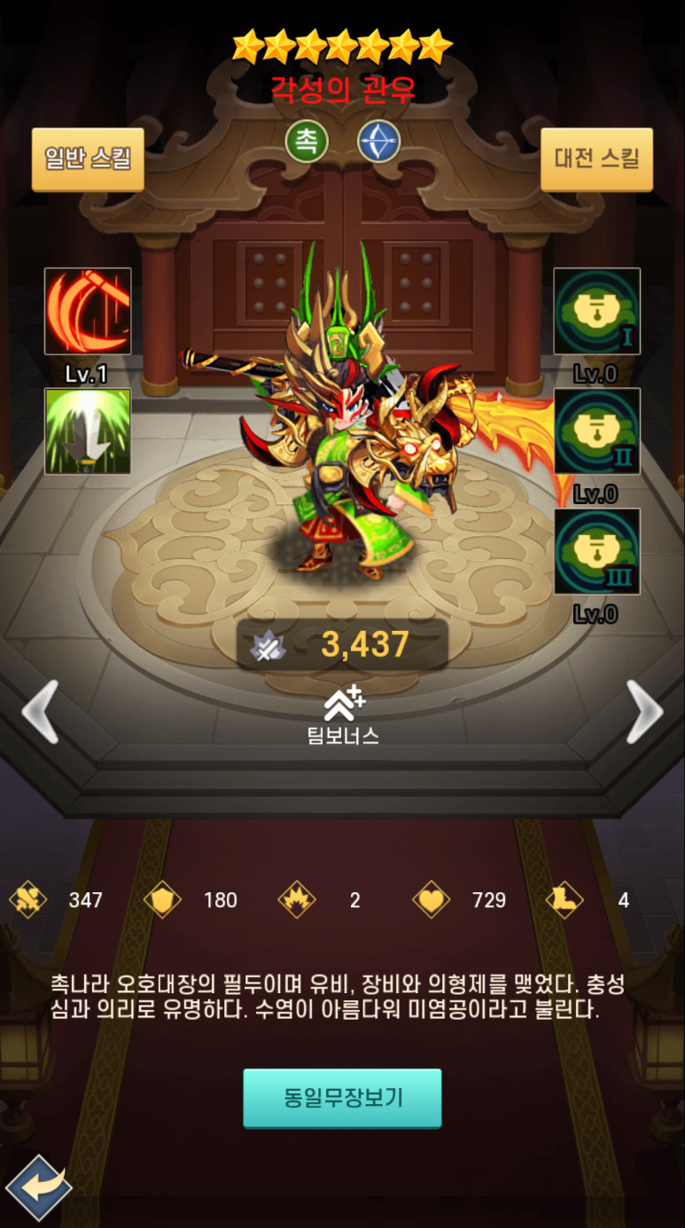 저의 경우 현재 보유하고 있는 장수들이 우연히도 평소 가장 좋아하는 오나라의 주요 캐릭터라 손책, 주유, 능통을 중심으로 플레이하고 있는데 도감을 보면 관우, 황충, 조운 등을 비롯한 촉나라의 오호대장군들이 매력적으로 그려져 있는 것 같아서 그들도 한번쯤 운용해 보고 싶었습니다. 특히 관우의 경우 적을 일정 확률로 처형하는 패시브를 가지고 있기 때문에 난이도가 높아질수록 체감능력도 많이 떨어지는 것 같습니다.