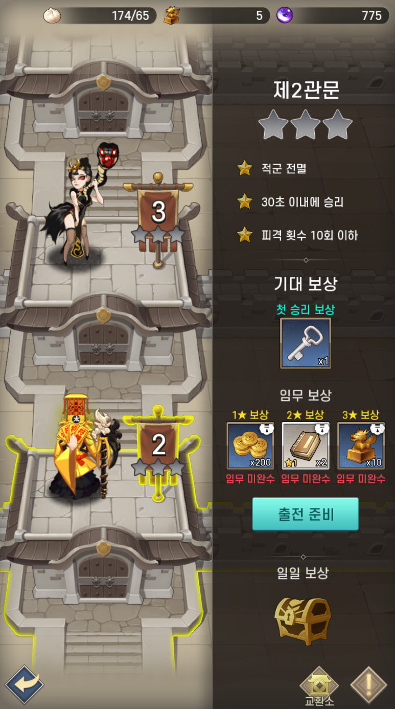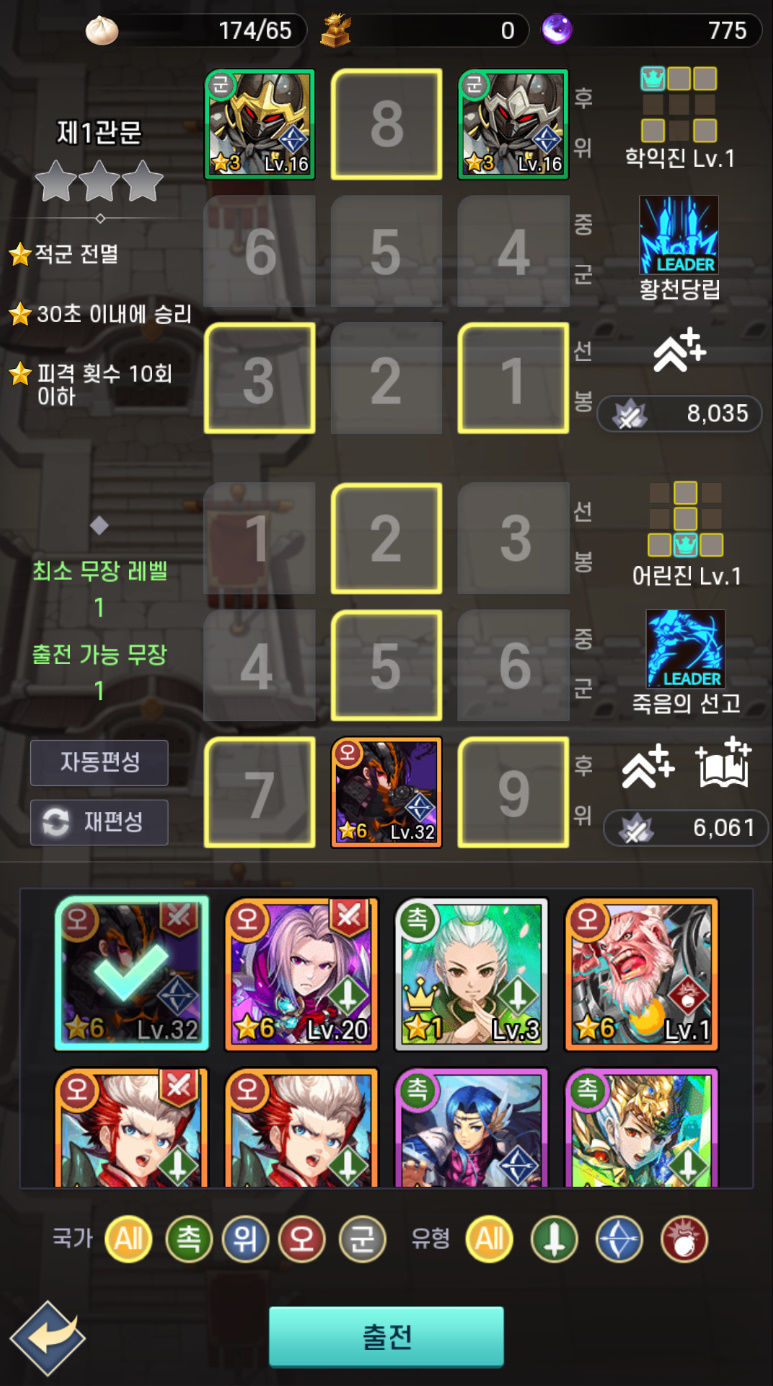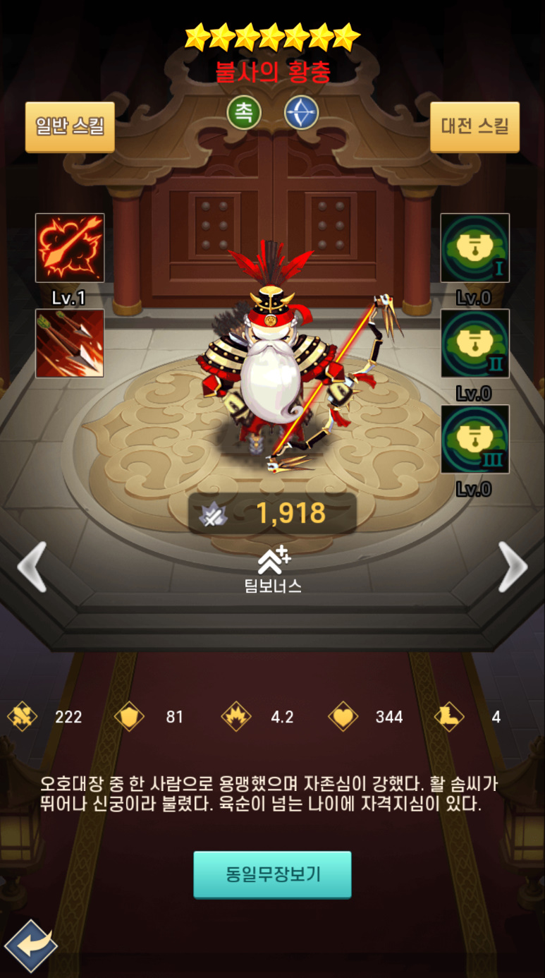 저의 경우 현재 보유하고 있는 장수들이 우연히도 평소 가장 좋아하는 오나라의 주요 캐릭터라 손책, 주유, 능통을 중심으로 플레이하고 있는데 도감을 보면 관우, 황충, 조운 등을 비롯한 촉나라의 오호대장군들이 매력적으로 그려져 있는 것 같아서 그들도 한번쯤 운용해 보고 싶었습니다. 특히 관우의 경우 적을 일정 확률로 처형하는 패시브를 가지고 있기 때문에 난이도가 높아질수록 체감능력도 많이 떨어지는 것 같습니다.