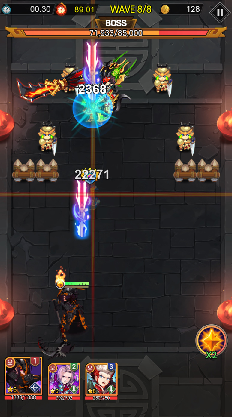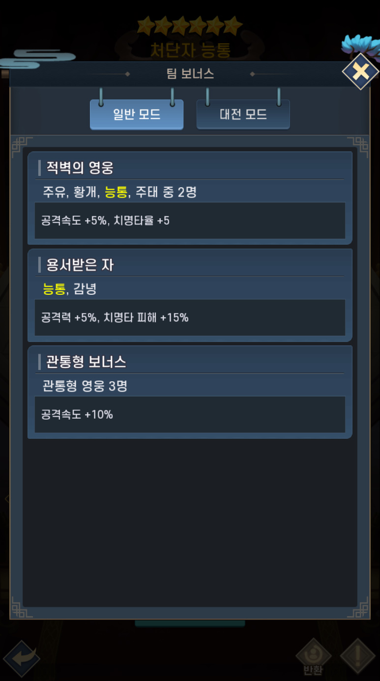 이 대전모드의 방금 소개한 관우로, 예를 들어 공격을 받으면 일정한 확률로 즉사하는 효과가 너무 강하기 때문에 크리티컬 관련 스탭이 올라가는 형태로 전환되며, 이러한 이유로 각 캐릭터의 능력치만큼 조합을 치밀하게 구성하고 그 특성에 맞게 진형을 선택하여 파티를 구성하느냐에 있어 더욱 중요해집니다.
